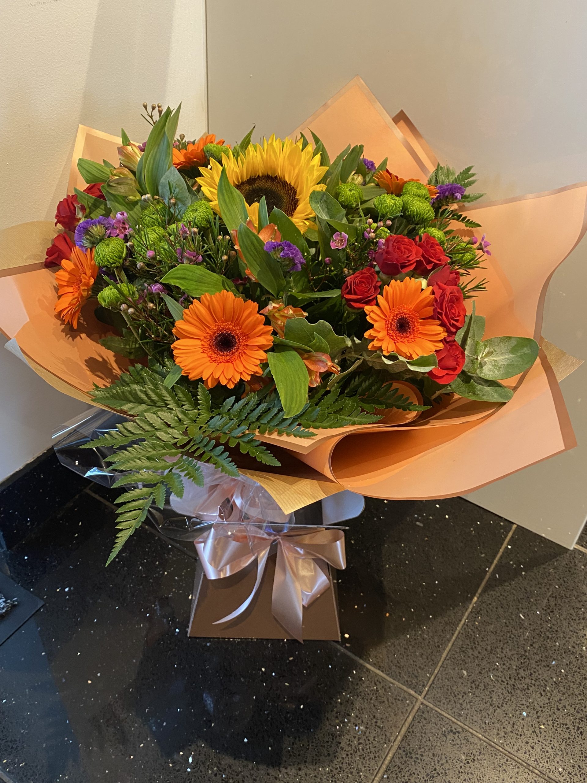Celebrate the beauty of autumn with this hand tied bouquet, bursting with seasonal charm. A radiant sunflower takes centre stage surrounded by beautiful blooms in rich, vibrant colours and full of texture. An ideal gift or just to brighten someone’s day.