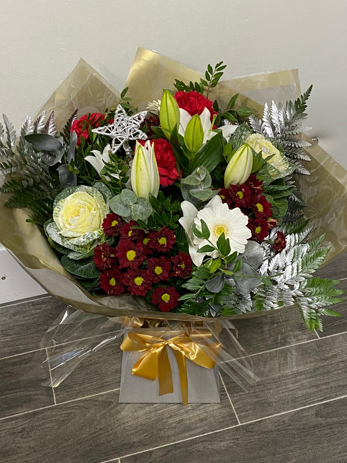 Seasonal blooms in red and white, a mix of green and silver foliage presented in a hand tied aqua bouquet.